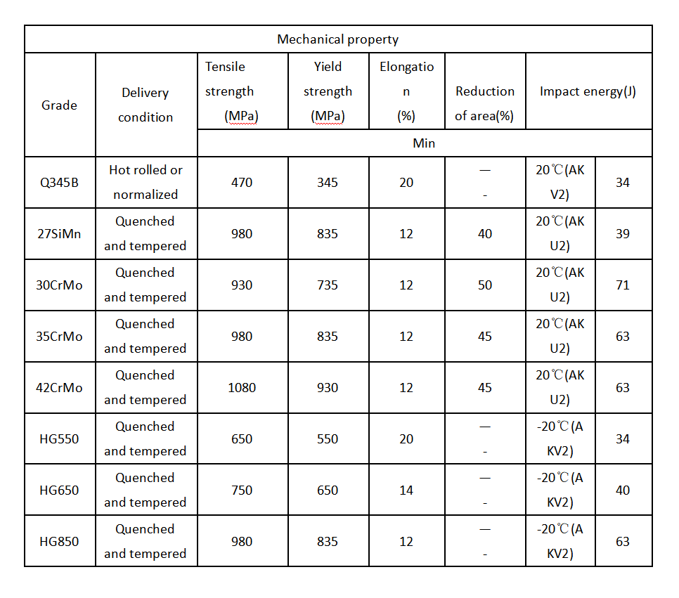 Grade: Q345B, 27SiMn, 30CrMo, 35CrMo, 42CrMo, HG550, HG650, and HG850, etc.